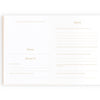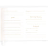 Gold foil stamped white waterproof linen hard cover, grosgrain ribbon, lay-flat binding. Patterned gold foil end pages and premium 115gsm FSC-certified acid-free paper. 40 question and 40 blank double-page spreads (enough for 40 guests to have their own individual double-page spread) with metallic gold ink. Packaged in a cello sleeve. Designed in Australia, printed in China.